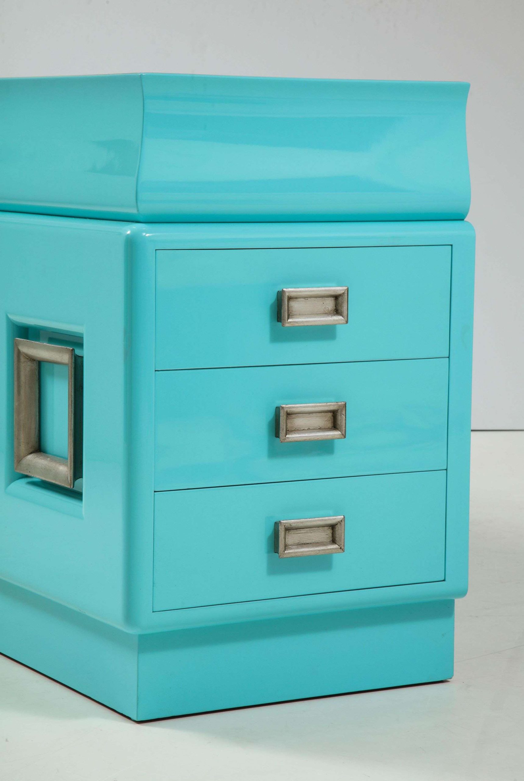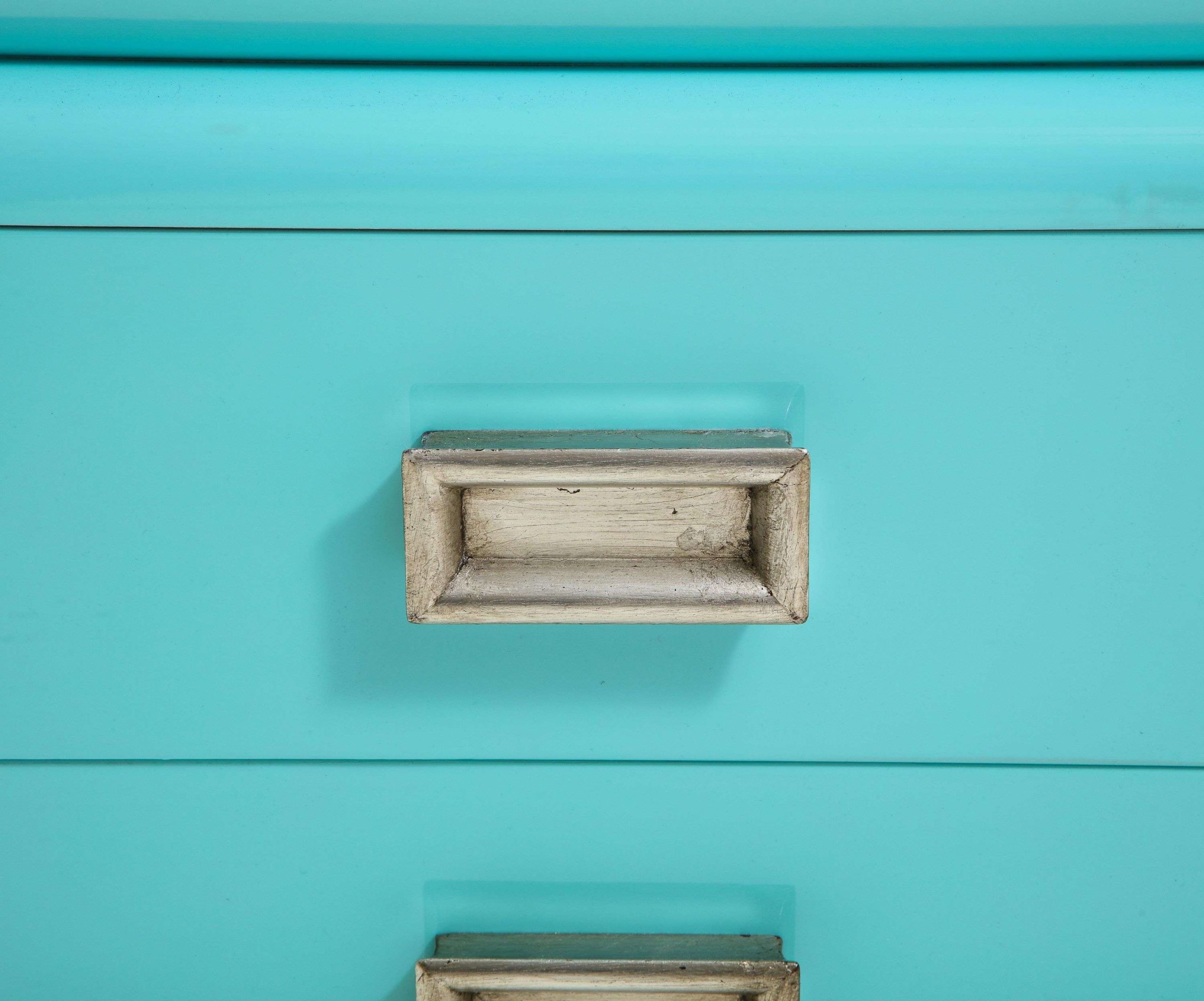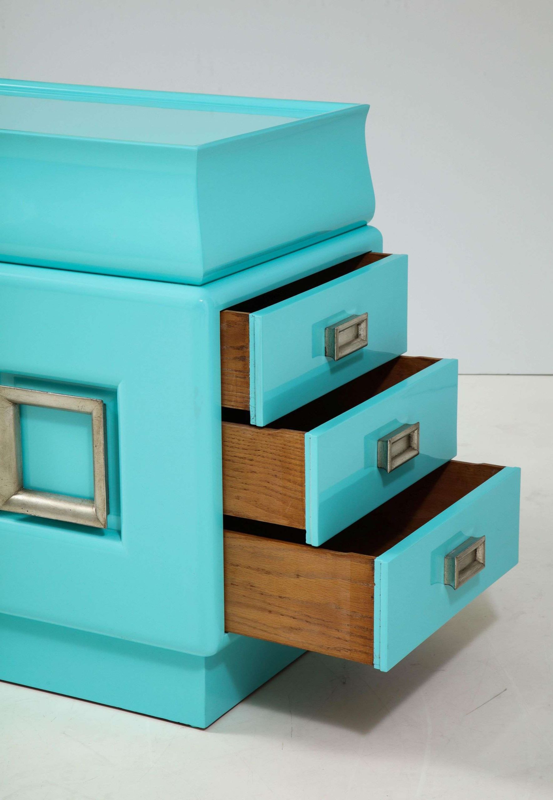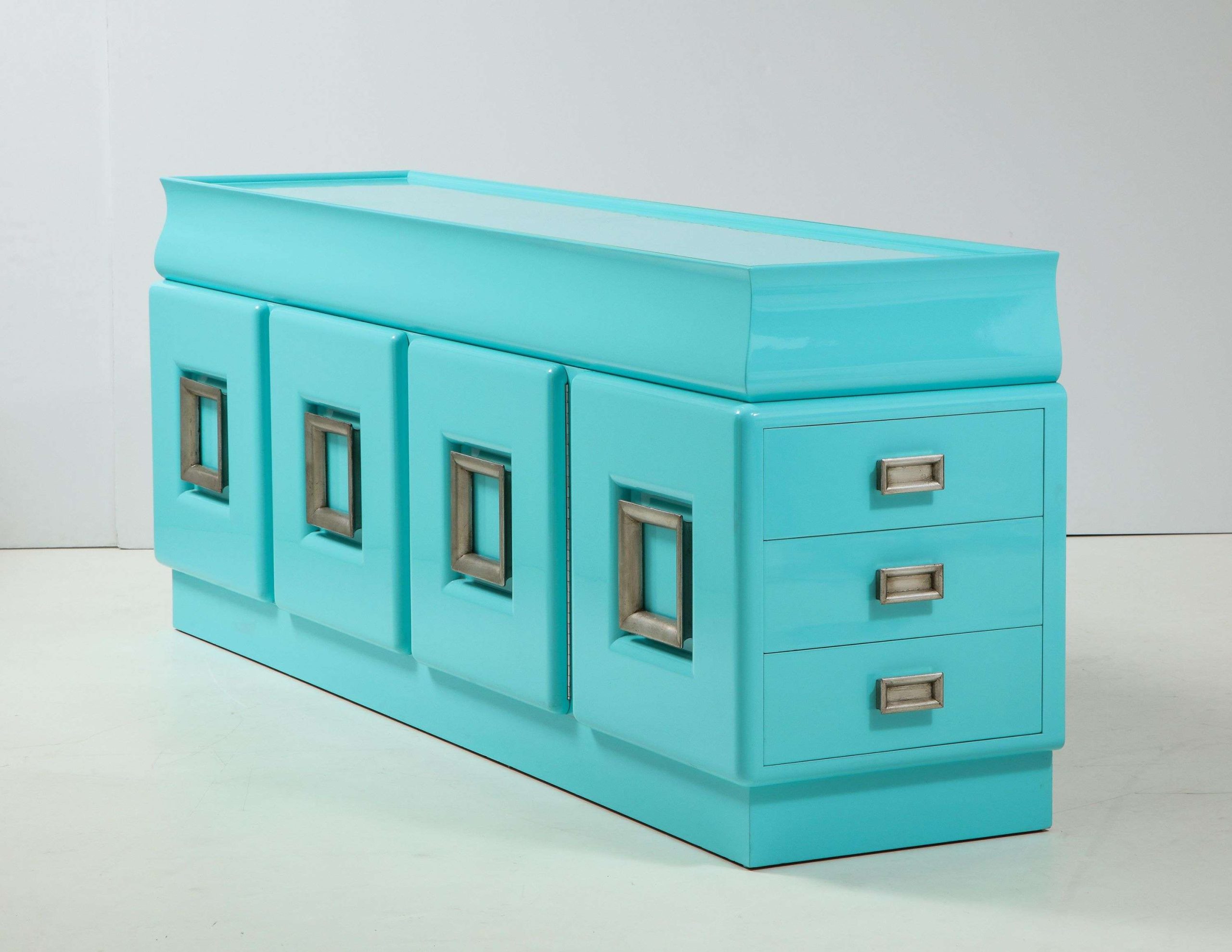 The Spectacular James Mont Cabinet, crafted in the United States during the 1950s, measures 223.52 cm wide, 53.34 cm deep, and 83.82 cm high, exemplifying mid-century modern design. This signed piece, newly restored with a stunning high-gloss lacquered finish, features two center doors with adjustable interior shelves and six side drawers, offering ample storage for a living room, dining area, or bedroom. The glazed silver-leafed pulls provide a striking contrast to the glossy softwood finish, enhancing its elegant aesthetic and making it a versatile addition to various interior styles.
