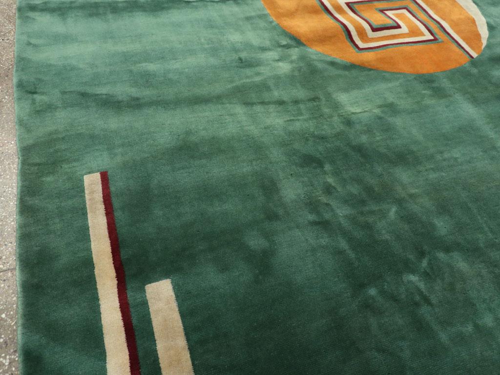 This striking mid-20th century Chinese Art Deco rug, measuring 276.86 cm wide by 360.68 cm long, features a bold geometric composition set against a rich green field. The design showcases an asymmetrical arrangement of modernist elements, reflecting the Art Deco movement’s embrace of modernity with its dynamic interplay of shapes and colors.