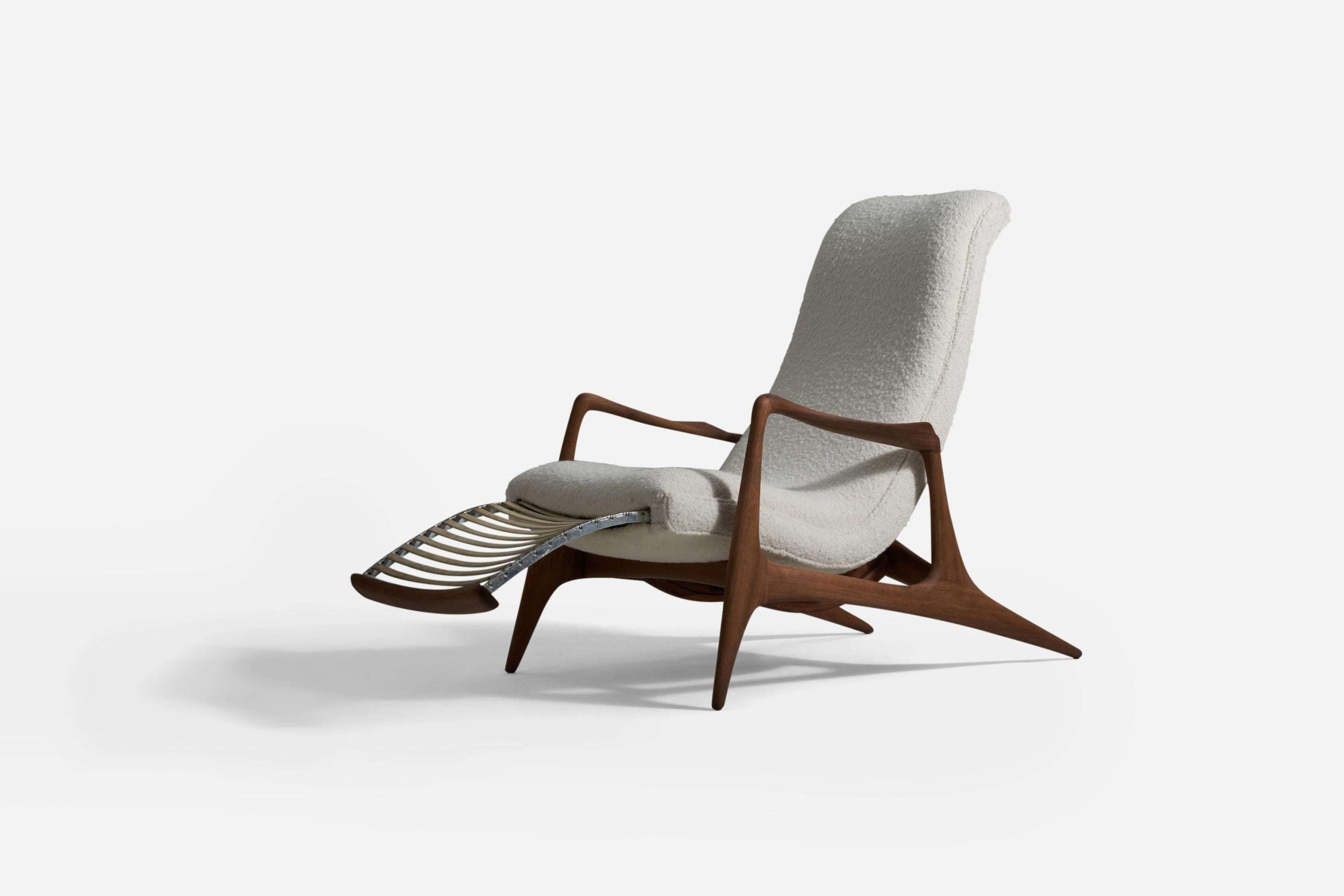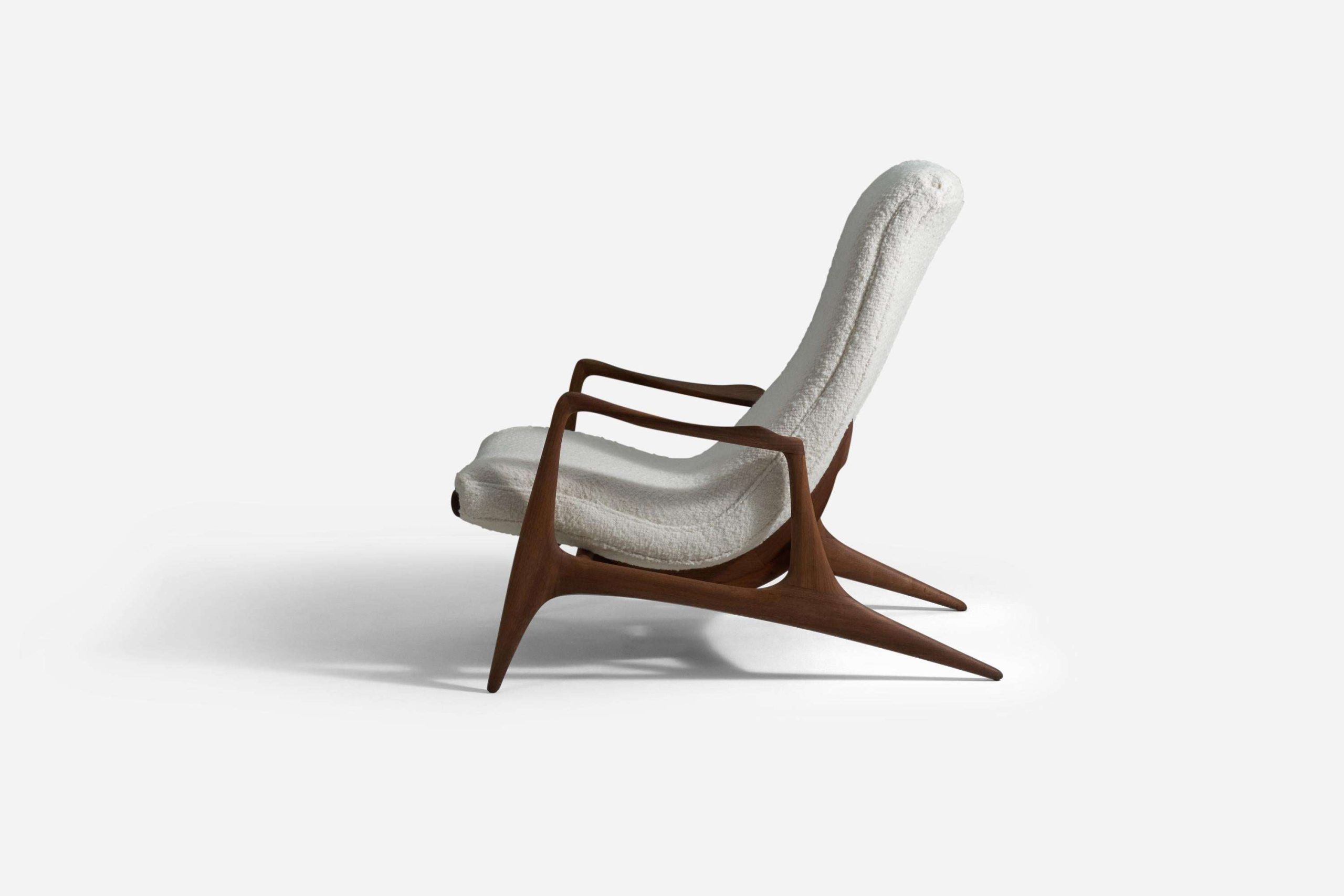 The Vladimir Kagan Lounge Chair, Walnut, White Bouclé, by Kagan-Dreyfuss, Inc., crafted in the USA circa 1950, measures 91.44 cm high, 68.58 cm wide, and 101.6 cm deep, embodying mid-century modern design with innovative elegance. This early adjustable chair features a finely carved walnut frame with a retractable footrest and a recently reupholstered high-end bouclé fabric, blending sculptural form with comfort. Branded for authenticity, it serves as a striking accent for any living room or lounge.