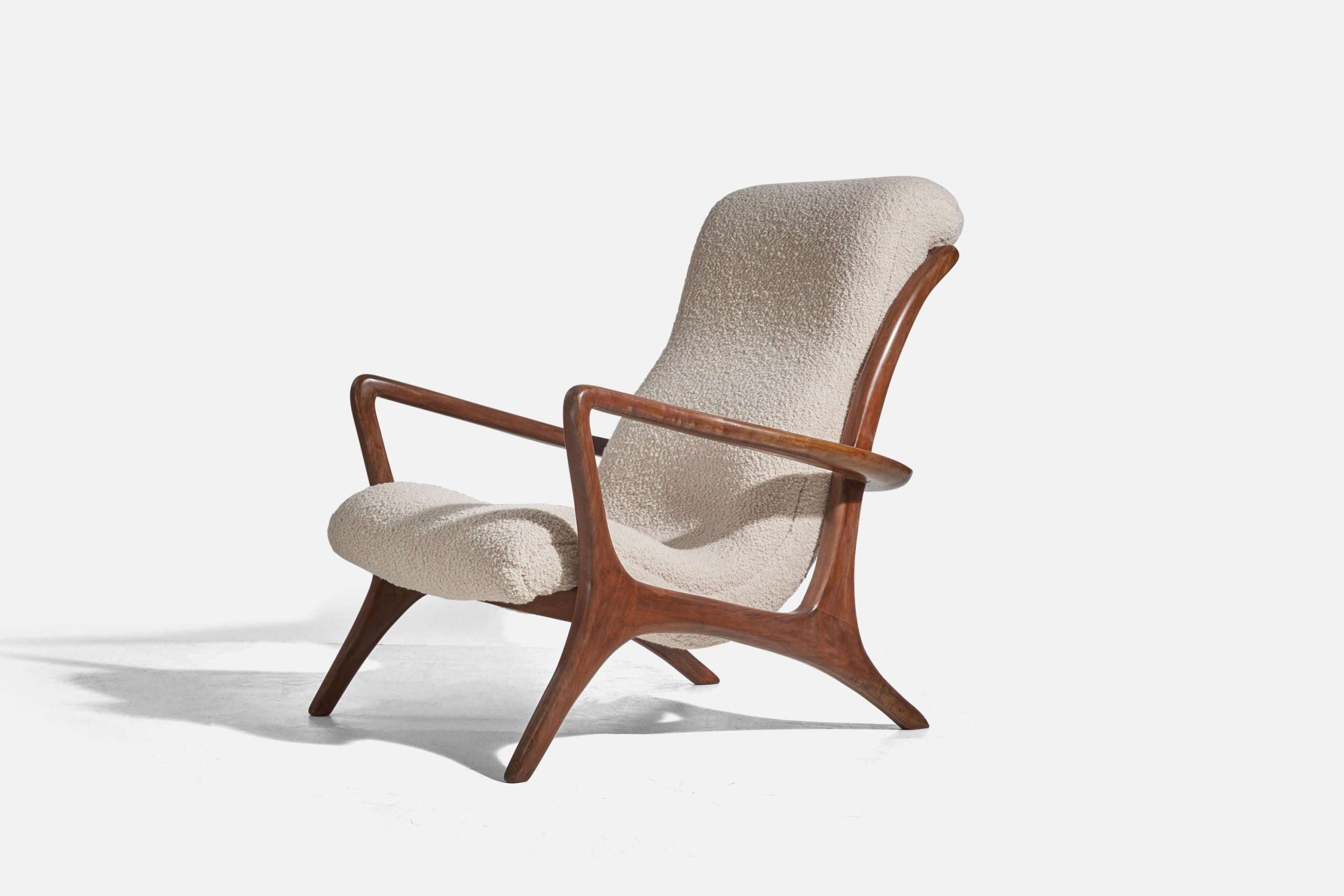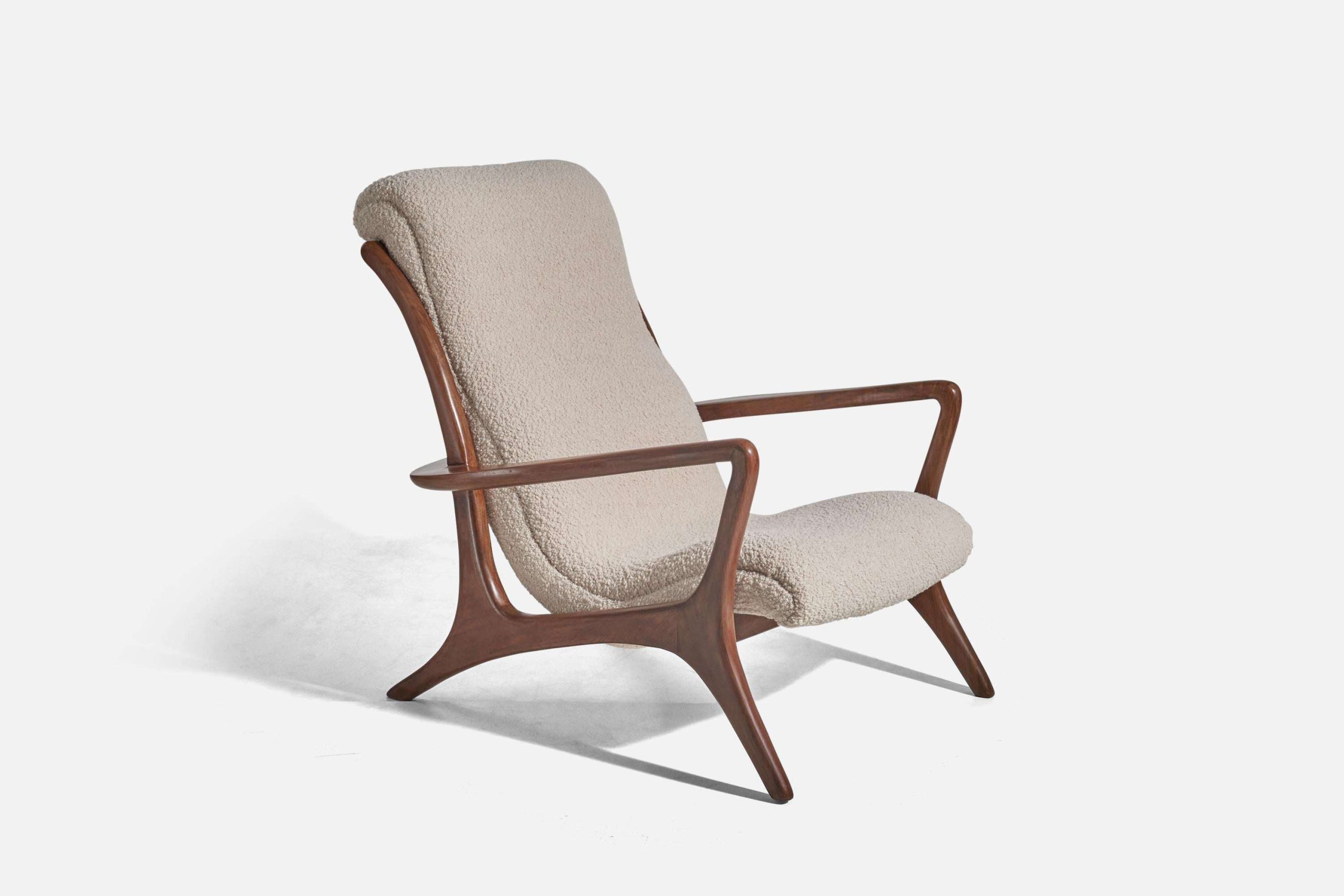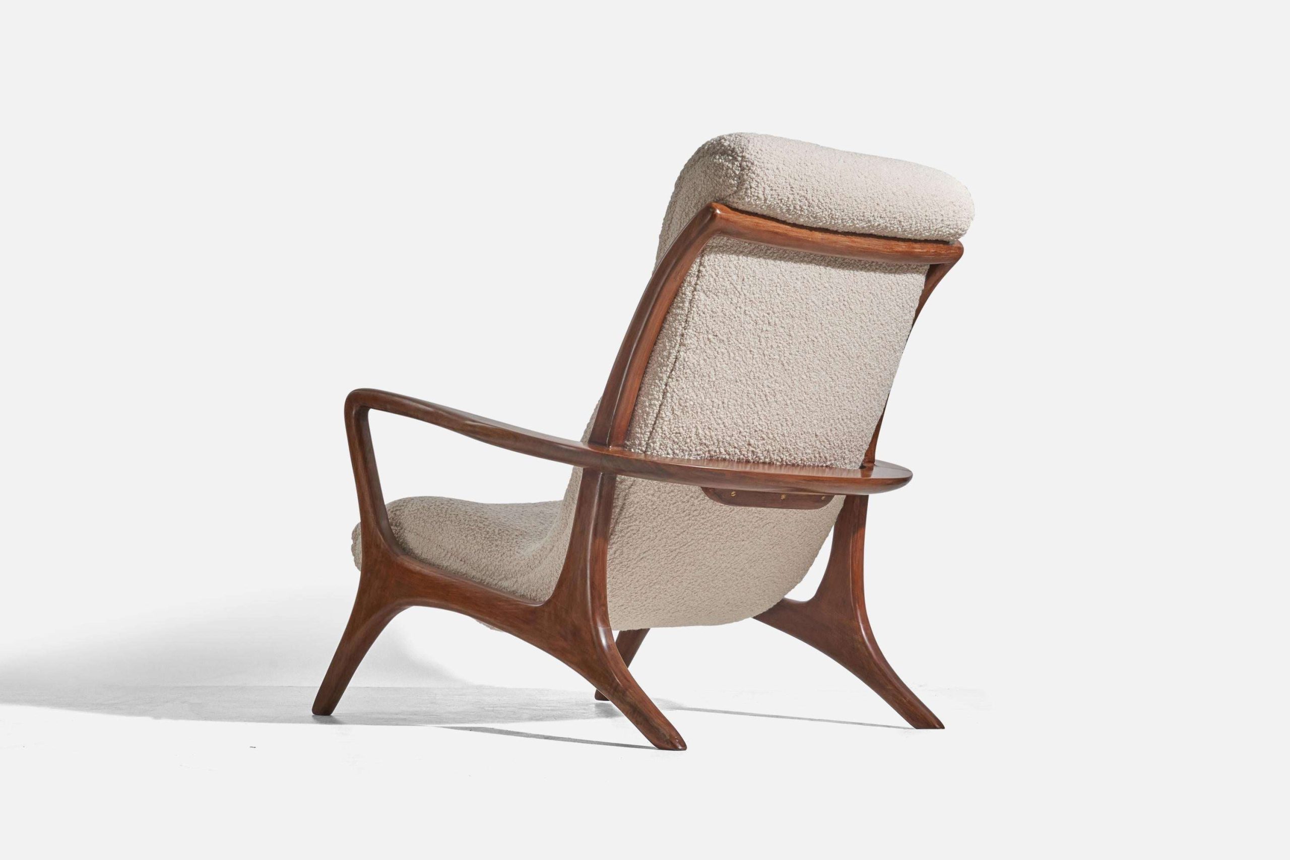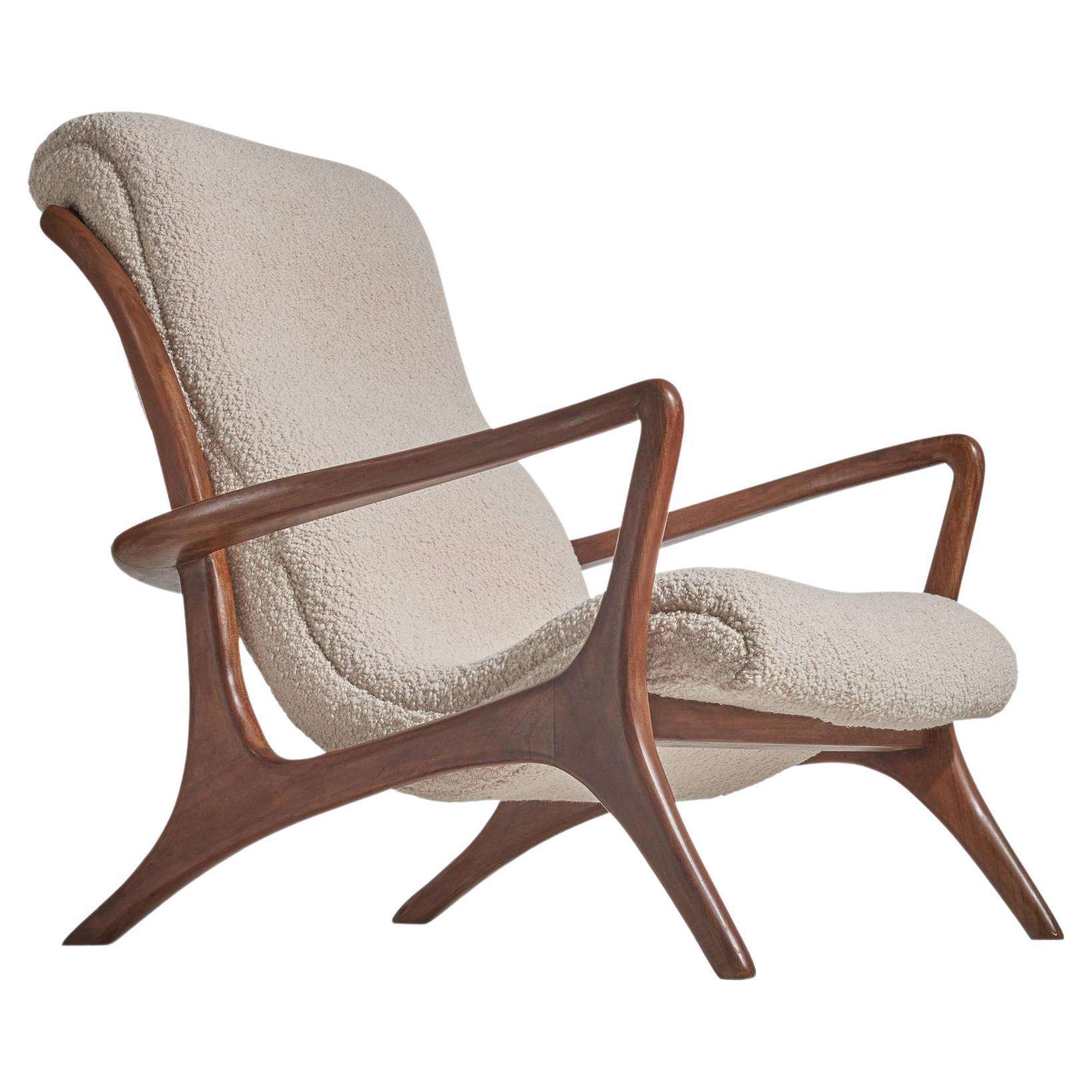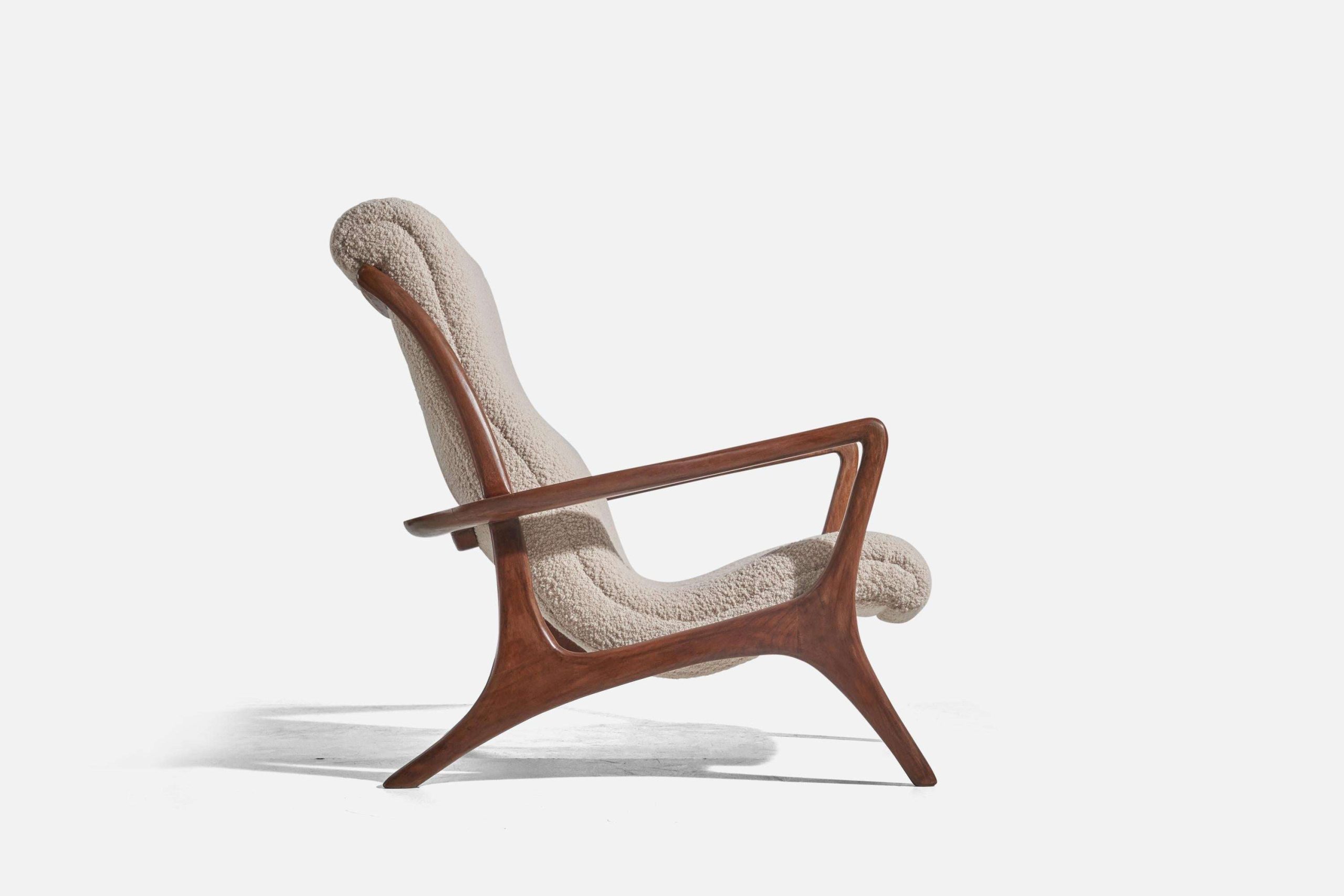 The Vladimir Kagan Rare Lounge Chair, Walnut, White Fabric, by Kagan-Dreyfuss, Inc., crafted in the USA circa 1970, measures 97.16 cm high, 84.46 cm wide, and 97.79 cm deep, embodying mid-century modern design with avant-garde flair. Designed by Vladimir Kagan in the 1950s, this piece features finely carved walnut with sculptural organic lines, reupholstered in high-end bouclé fabric, offering both striking aesthetics and comfortable seating for any living room or lounge.