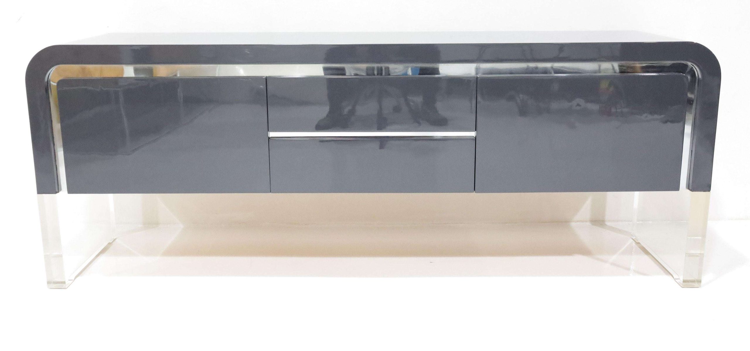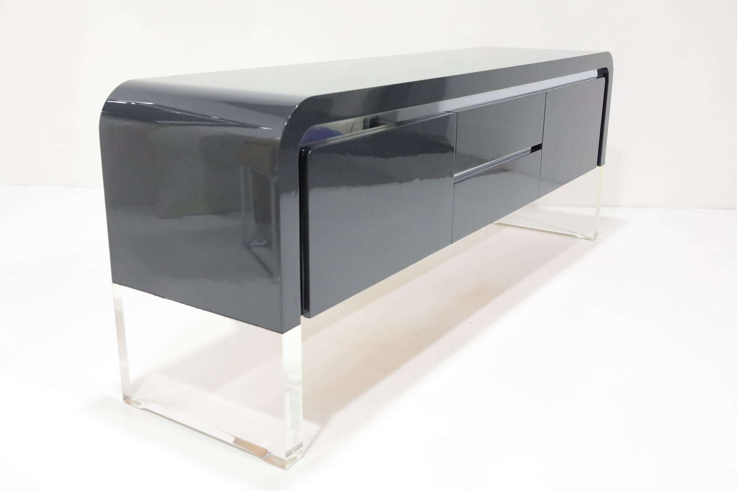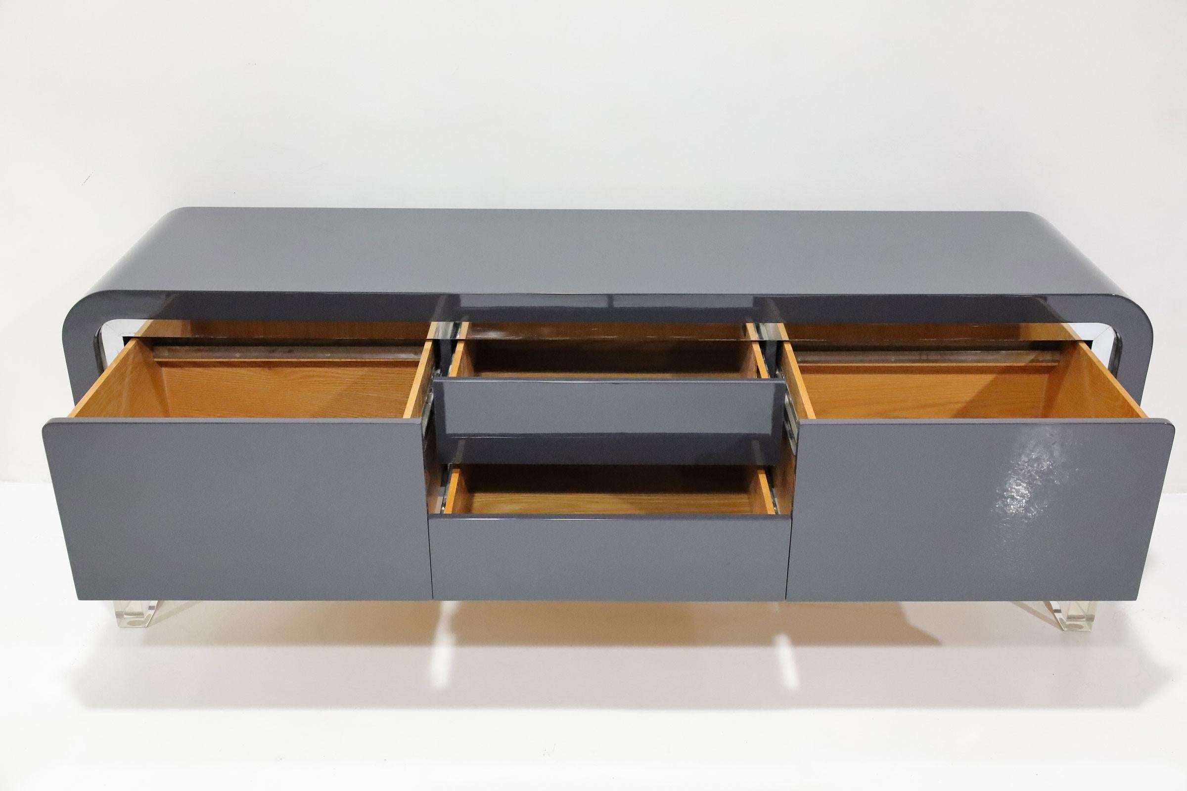 The Vladimir Kagan Ribbon Credenza, crafted in the United States in the 1980s, measures 198.12 cm wide, 48.9 cm deep, and 73.66 cm high, embodying a mid-century modern design with a futuristic twist. Originally designed in 1979, this piece features a smooth waterfall edge that cascades into Lucite legs, breaking from traditional rectilinear forms. Constructed from wood with steel accents, it has been fully restored with a sleek gray lacquer finish, and the Lucite legs professionally polished, showcasing thoughtful details that blend functionality with style, offering ample storage for a dining room, office, or living space with a distinctive aesthetic.