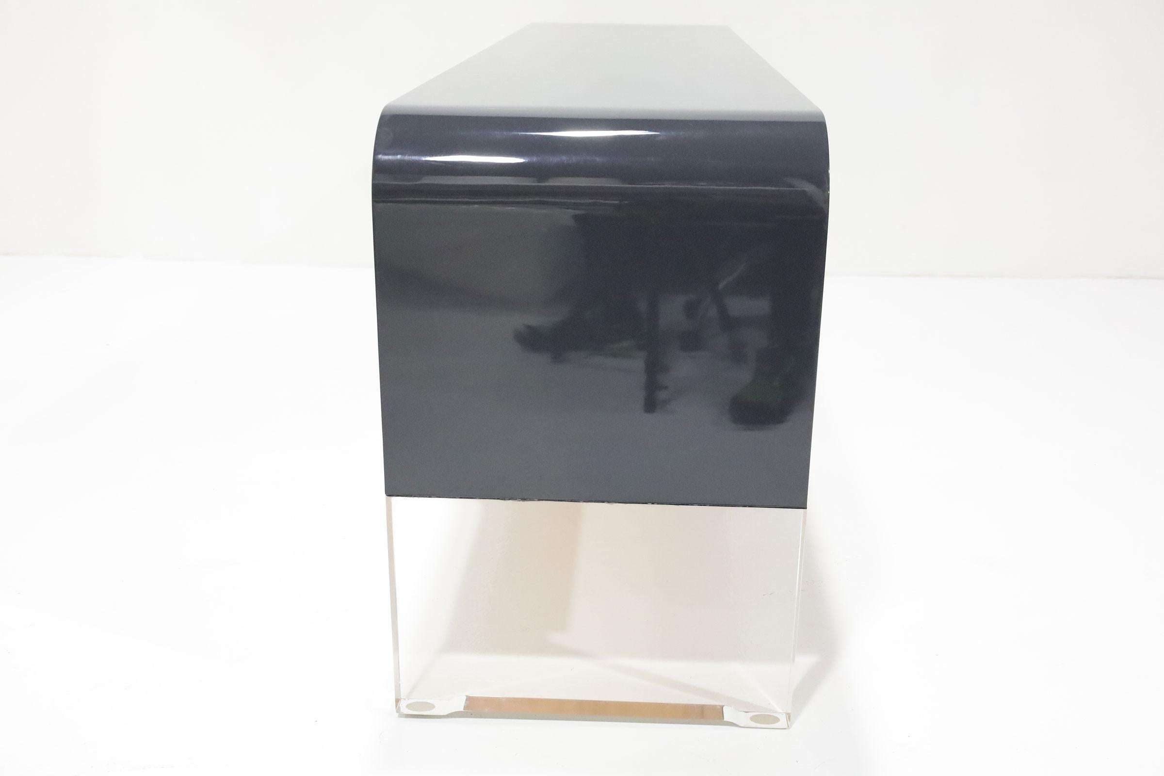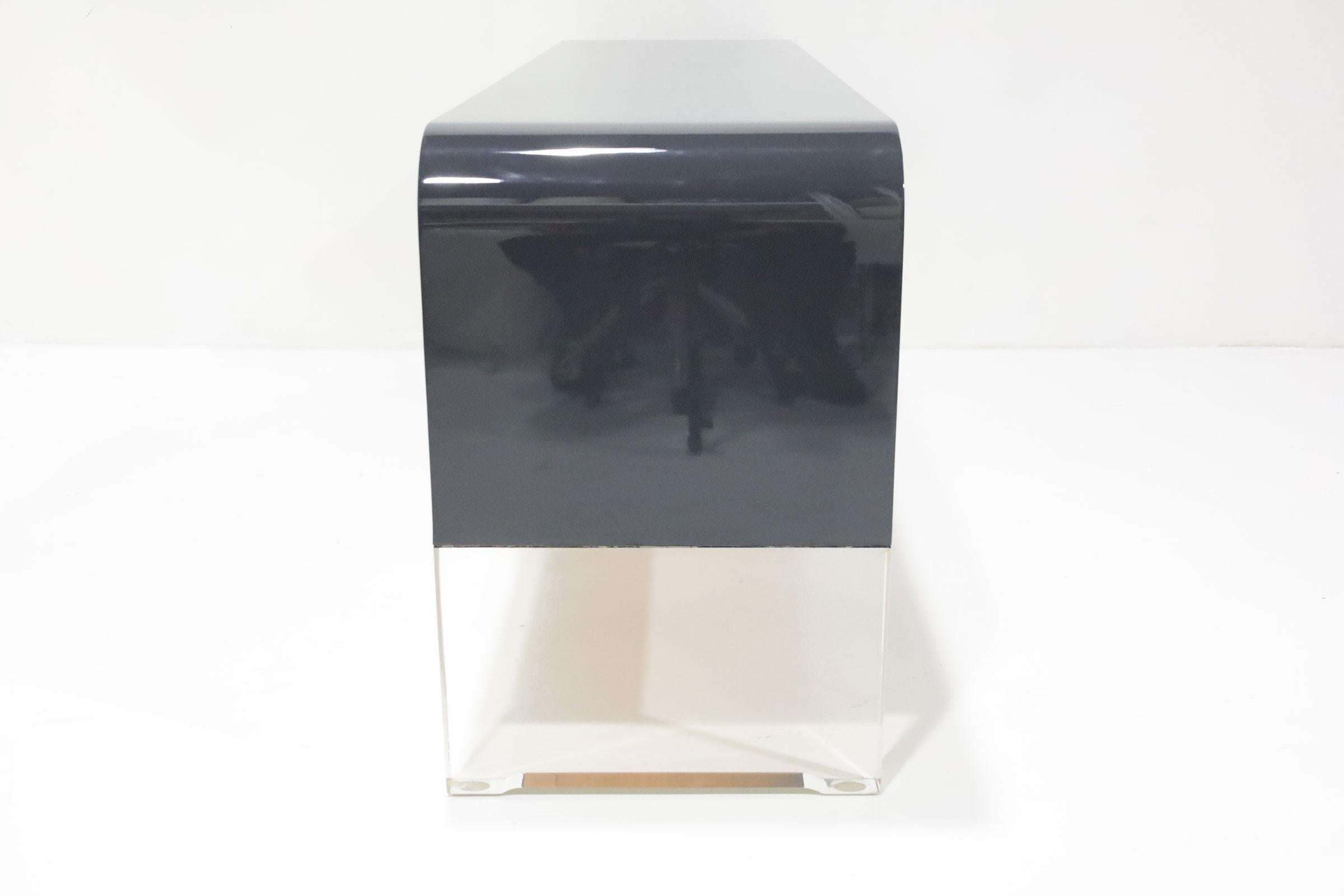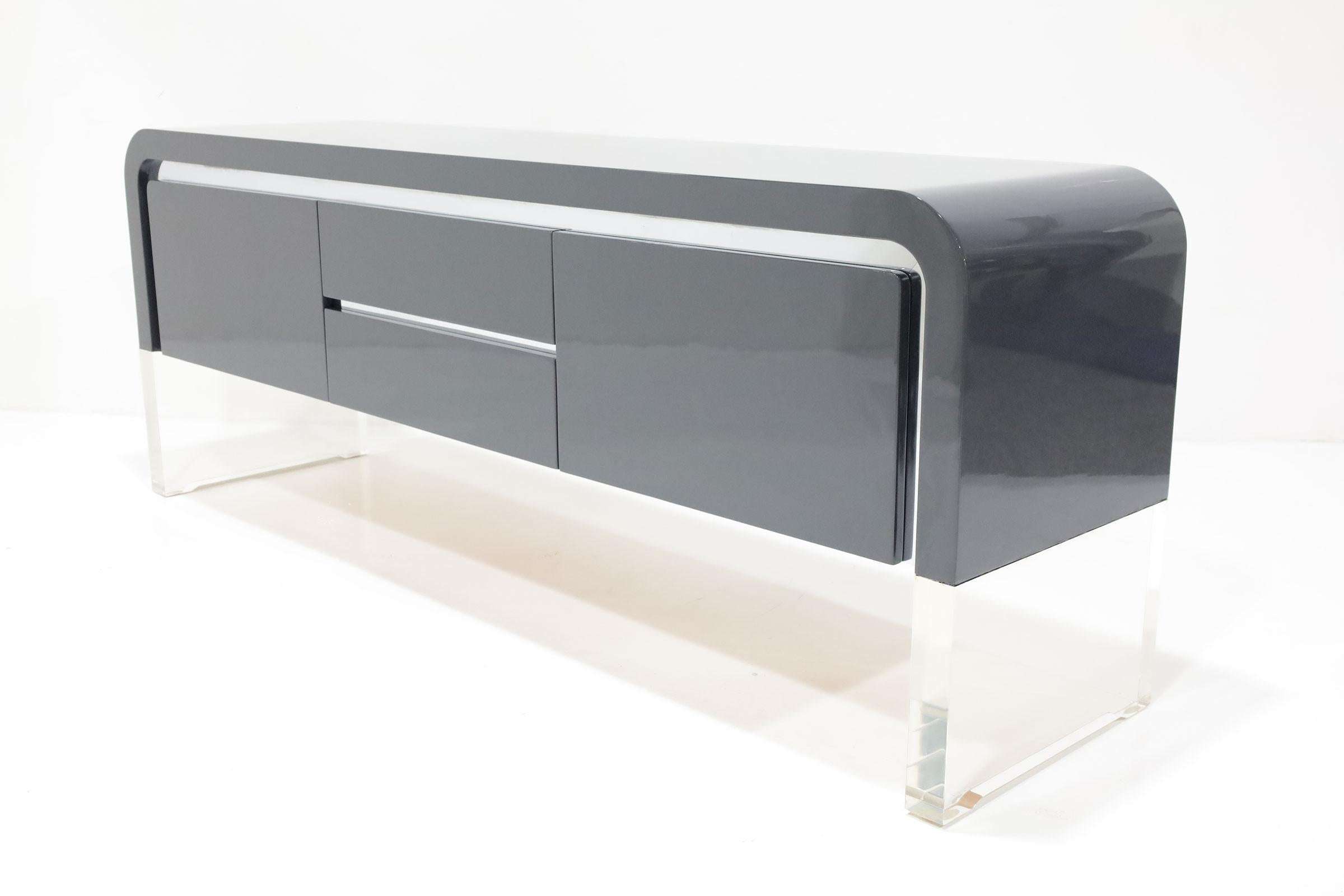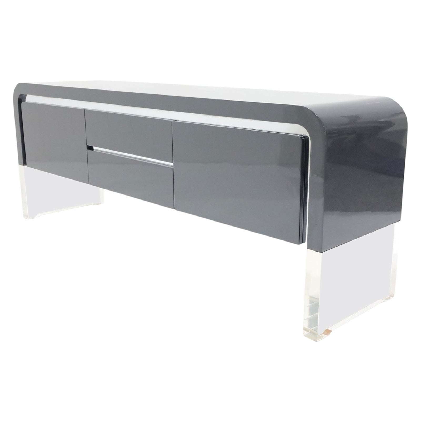 The Vladimir Kagan Ribbon Credenza, crafted in the United States in the 1980s, measures 198.12 cm wide, 48.9 cm deep, and 73.66 cm high, embodying a mid-century modern design with a futuristic twist. Originally designed in 1979, this piece features a smooth waterfall edge that cascades into Lucite legs, breaking from traditional rectilinear forms. Constructed from wood with steel accents, it has been fully restored with a sleek gray lacquer finish, and the Lucite legs professionally polished, showcasing thoughtful details that blend functionality with style, offering ample storage for a dining room, office, or living space with a distinctive aesthetic.