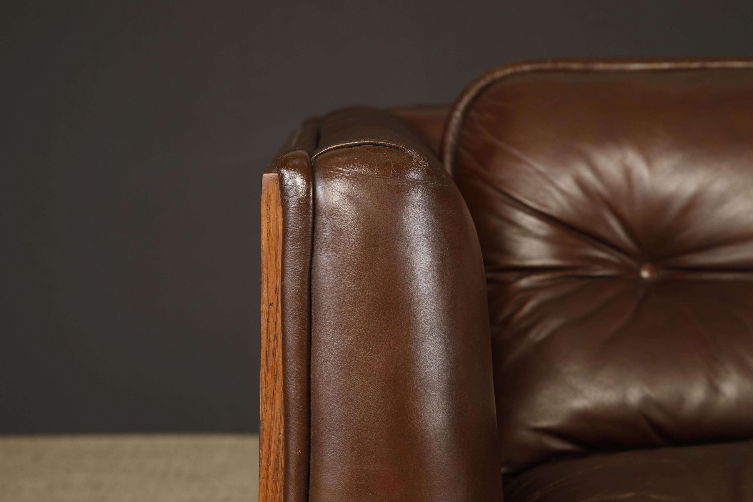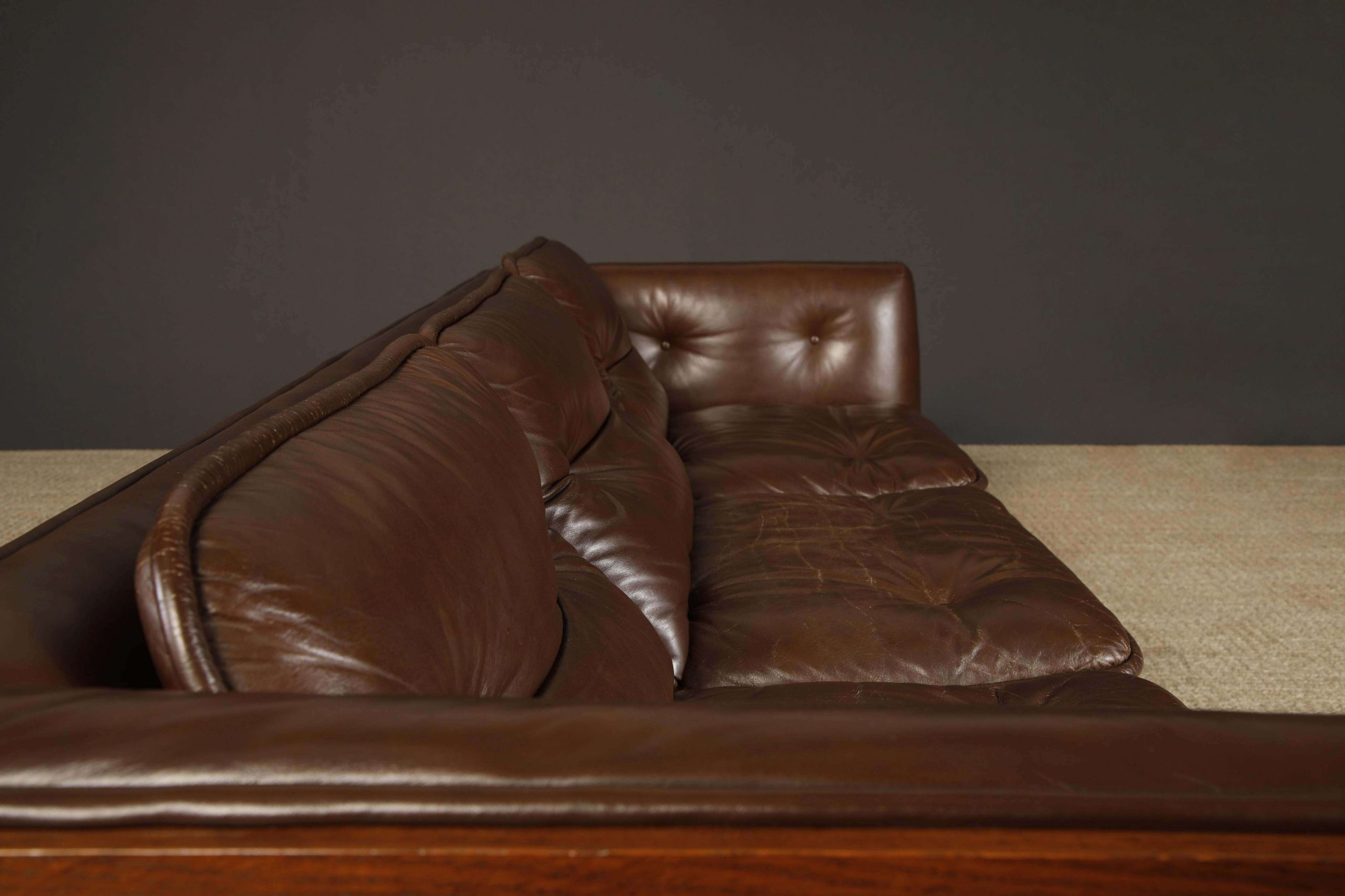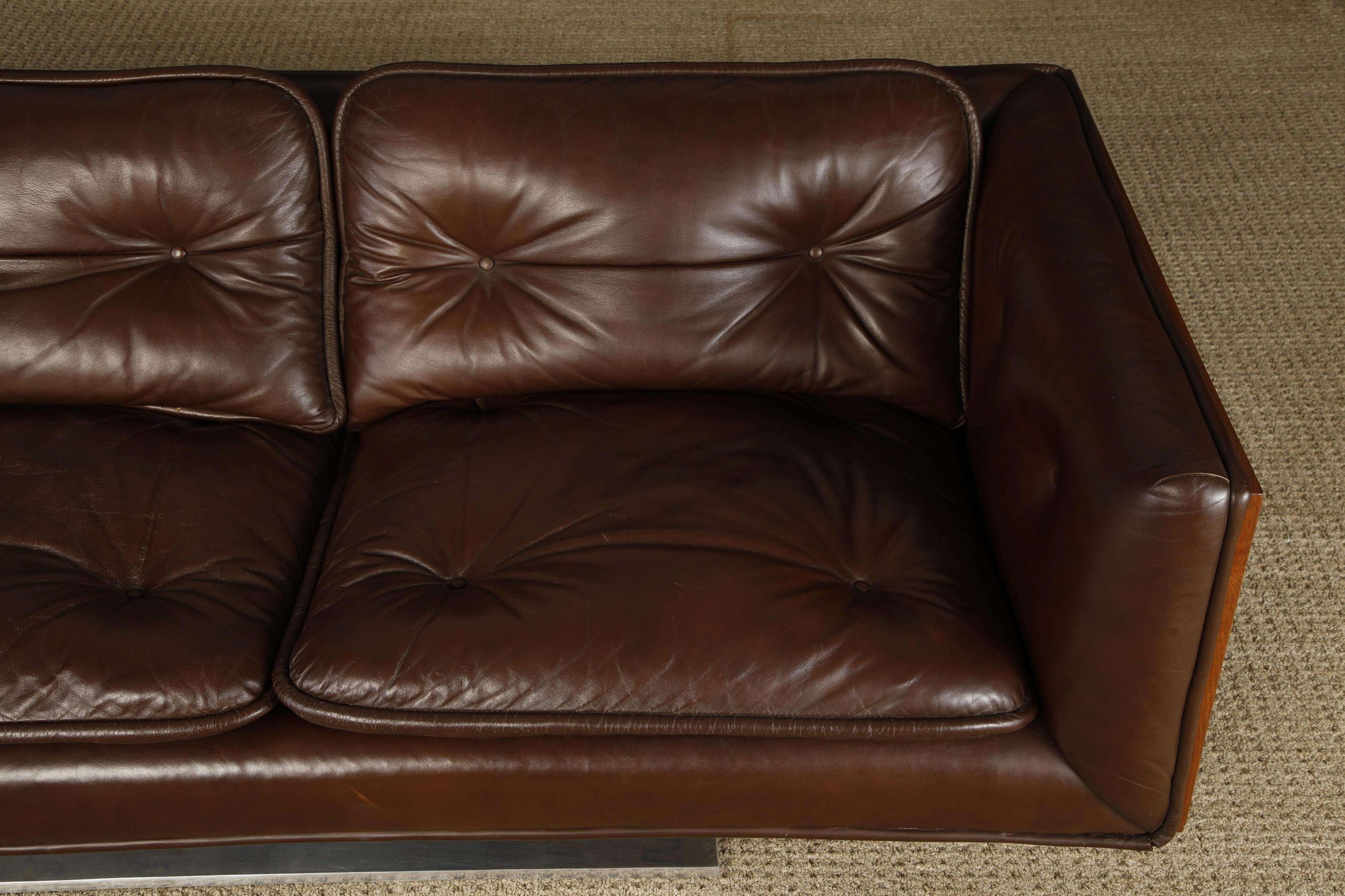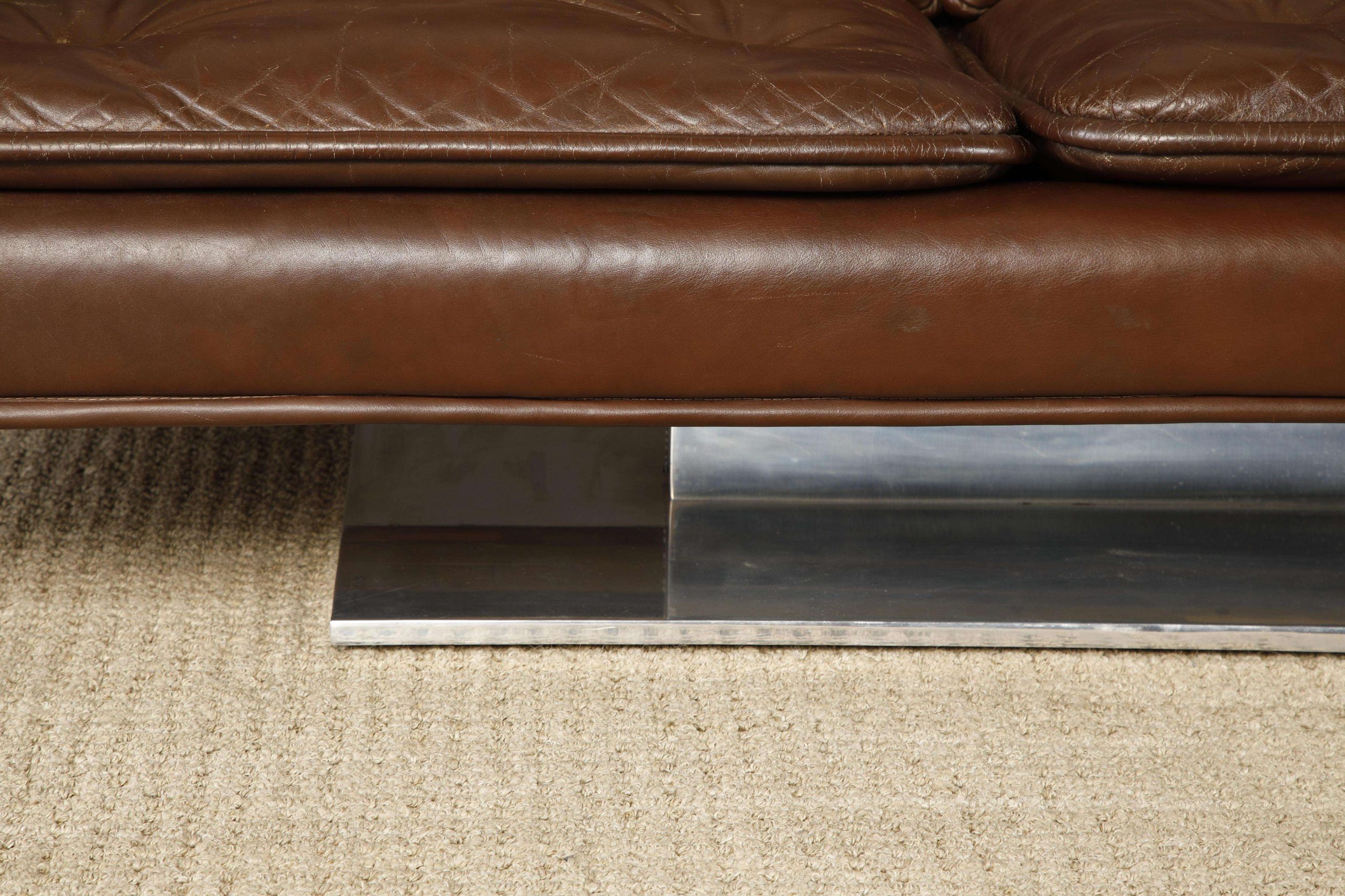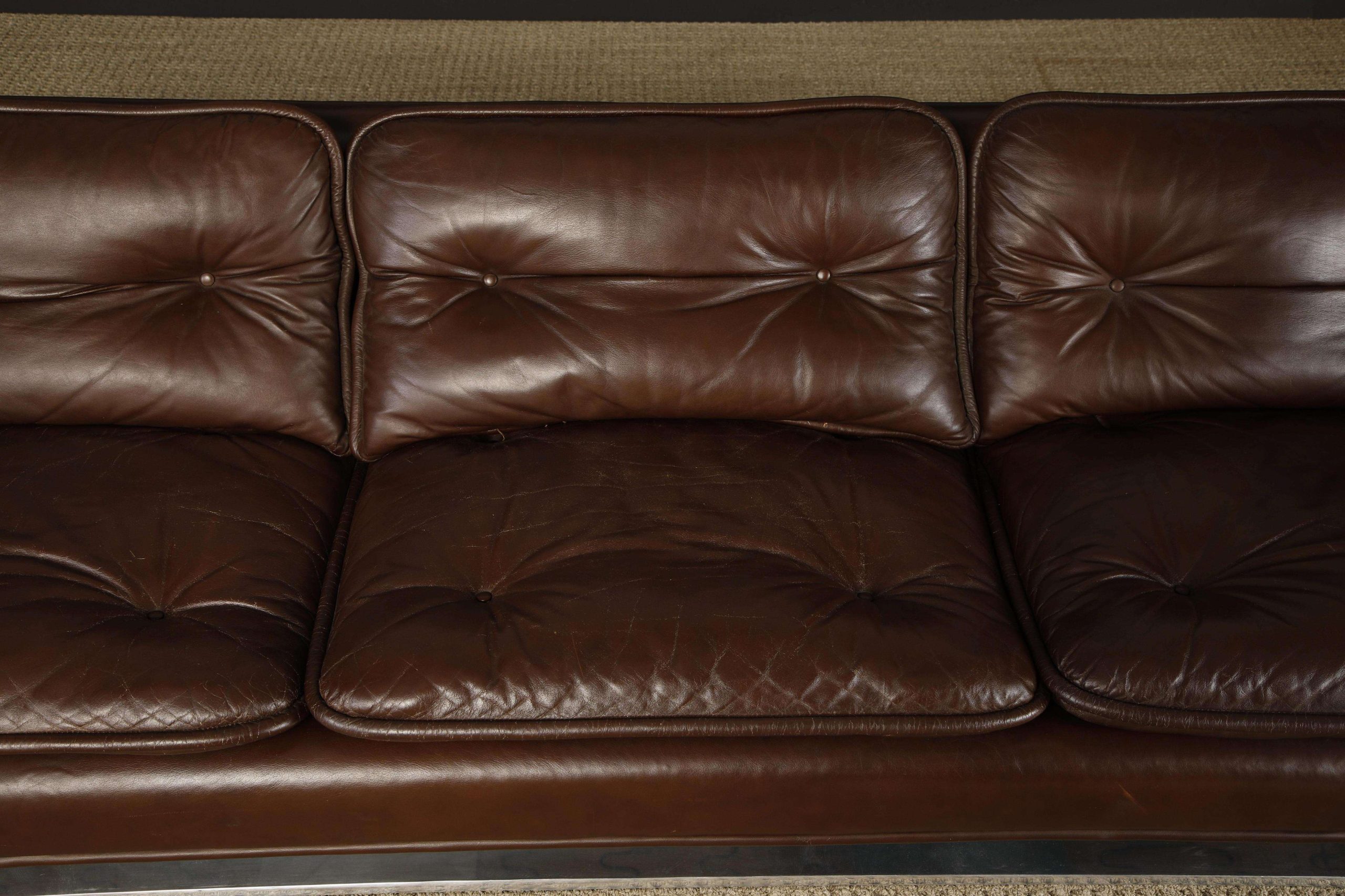 In good condition with minor repairs to the leather piping and light patina on cushions, this circa 1970 sofa is ideal for a variety of interiors, from contemporary to Art Deco, or high-rise executive offices, offering a coveted piece for design connoisseurs.