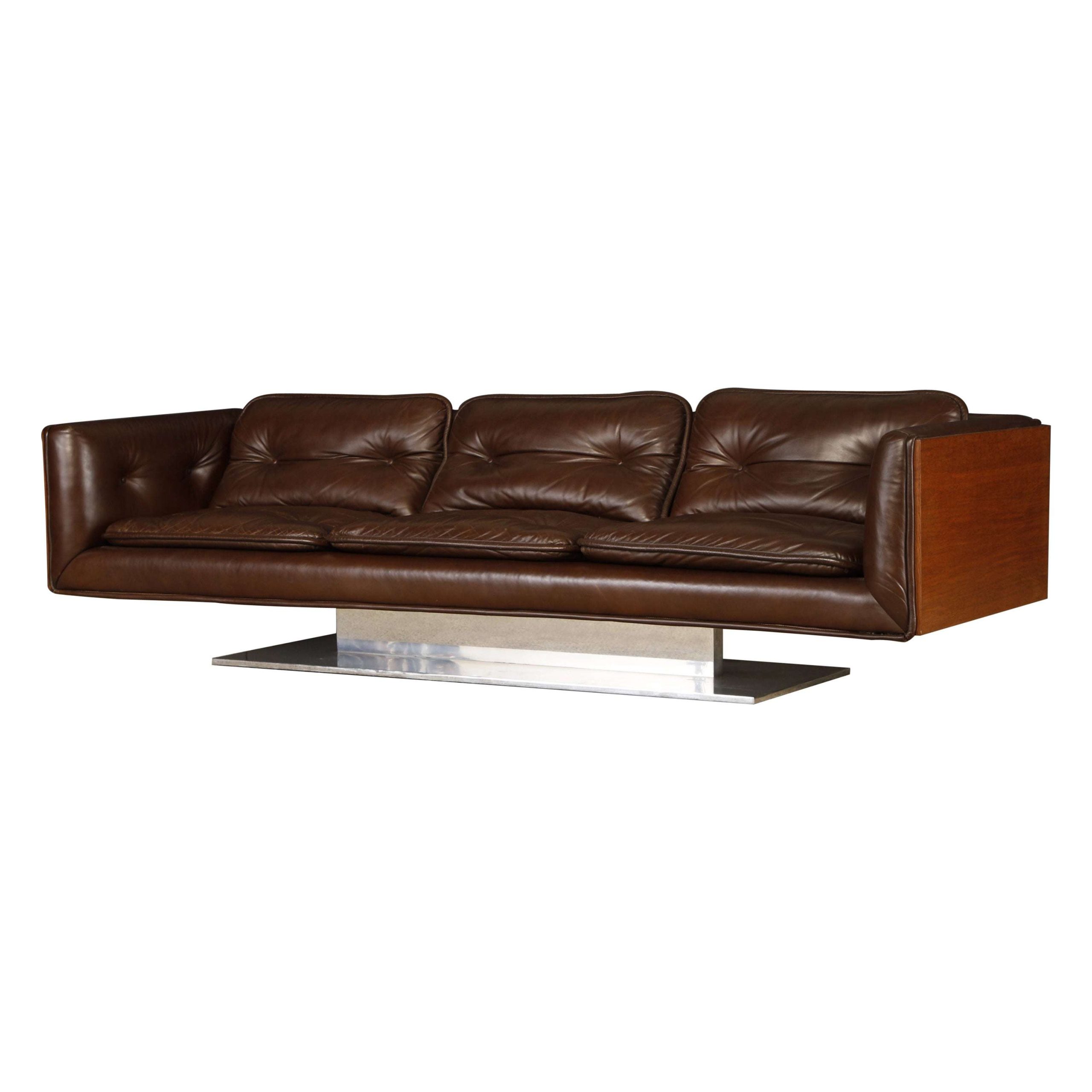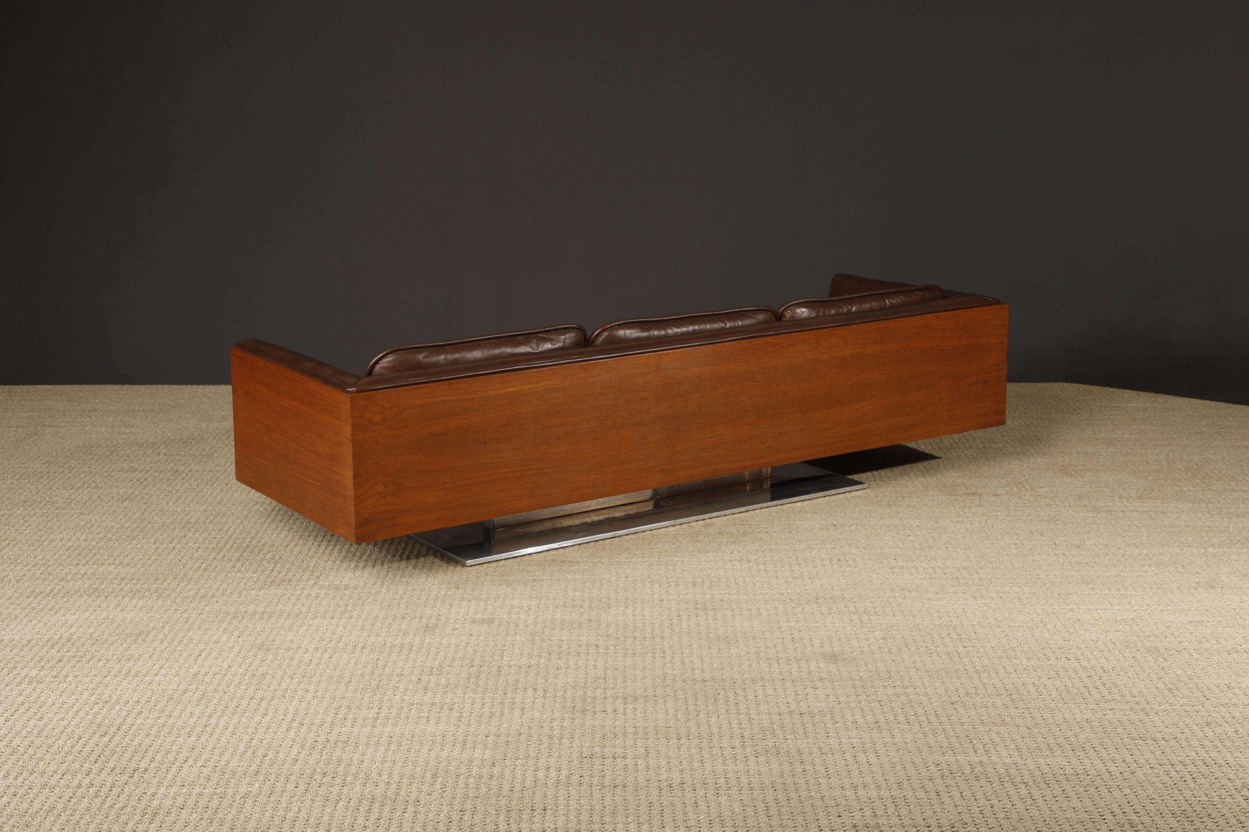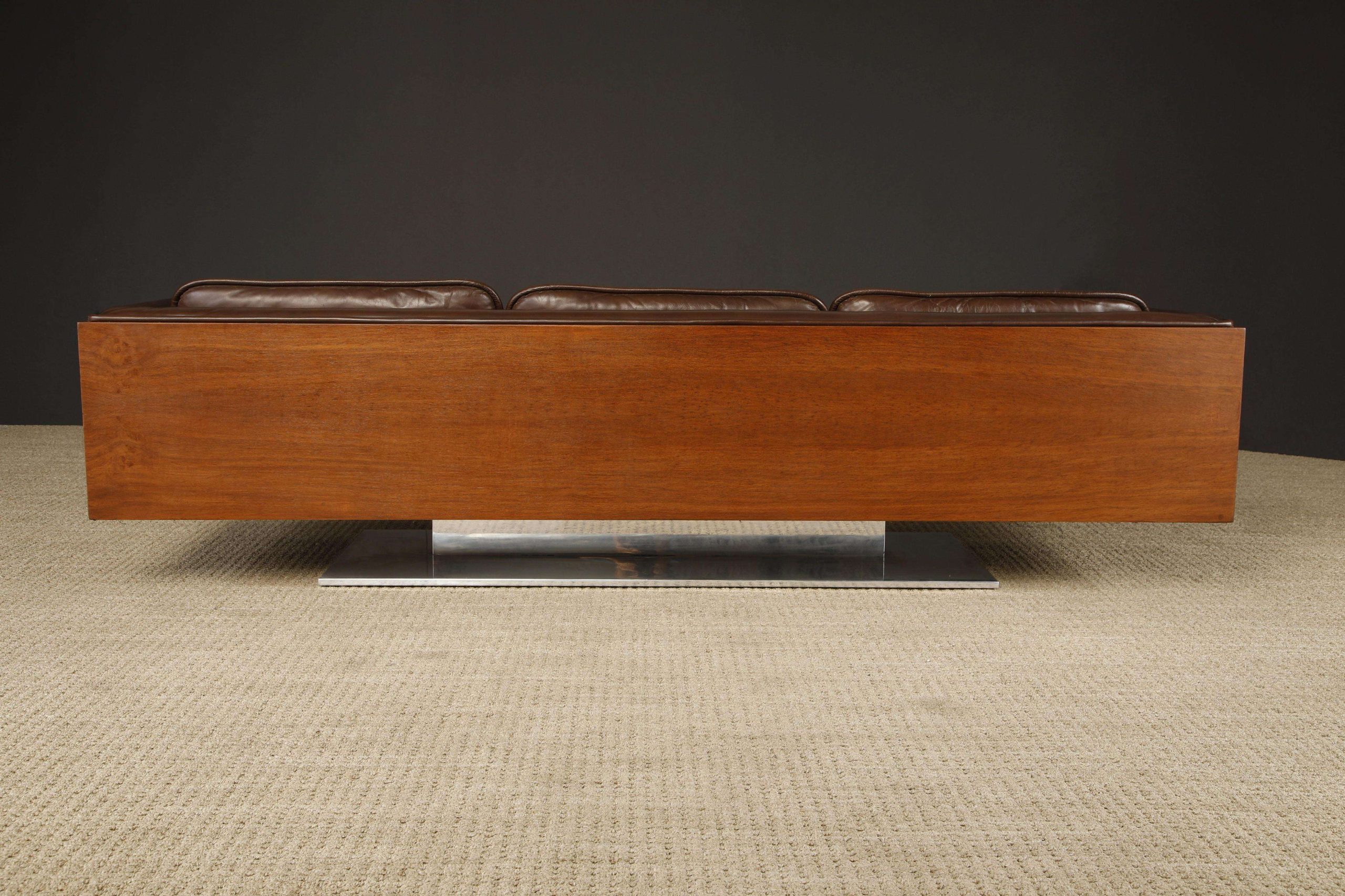 The Warren Platner Executive Leather Case Sofa, designed for Lehigh Leopold circa 1970, measures 235.59 cm wide, 81.28 cm deep, and 67.31 cm high with a seat height of 41.91 cm. This rare collector’s piece features a floating walnut case with deep brown tufted leather upholstery and cushions, supported by a polished steel pedestal base, offering a luxurious and sculptural presence.