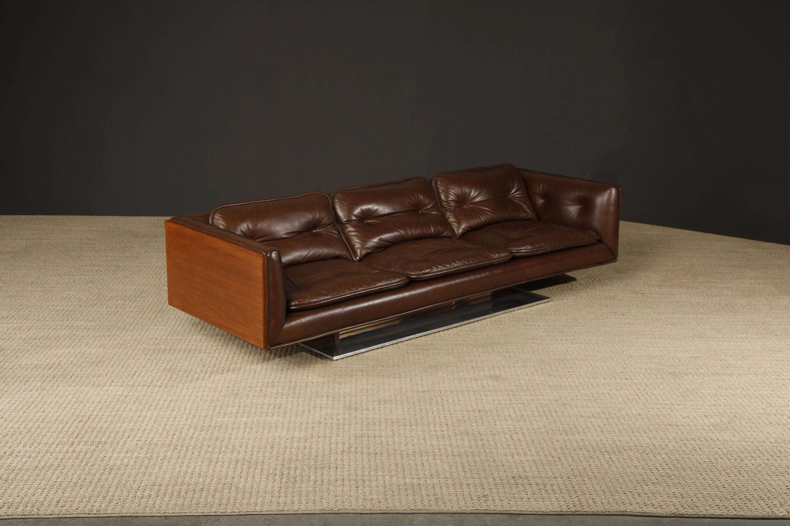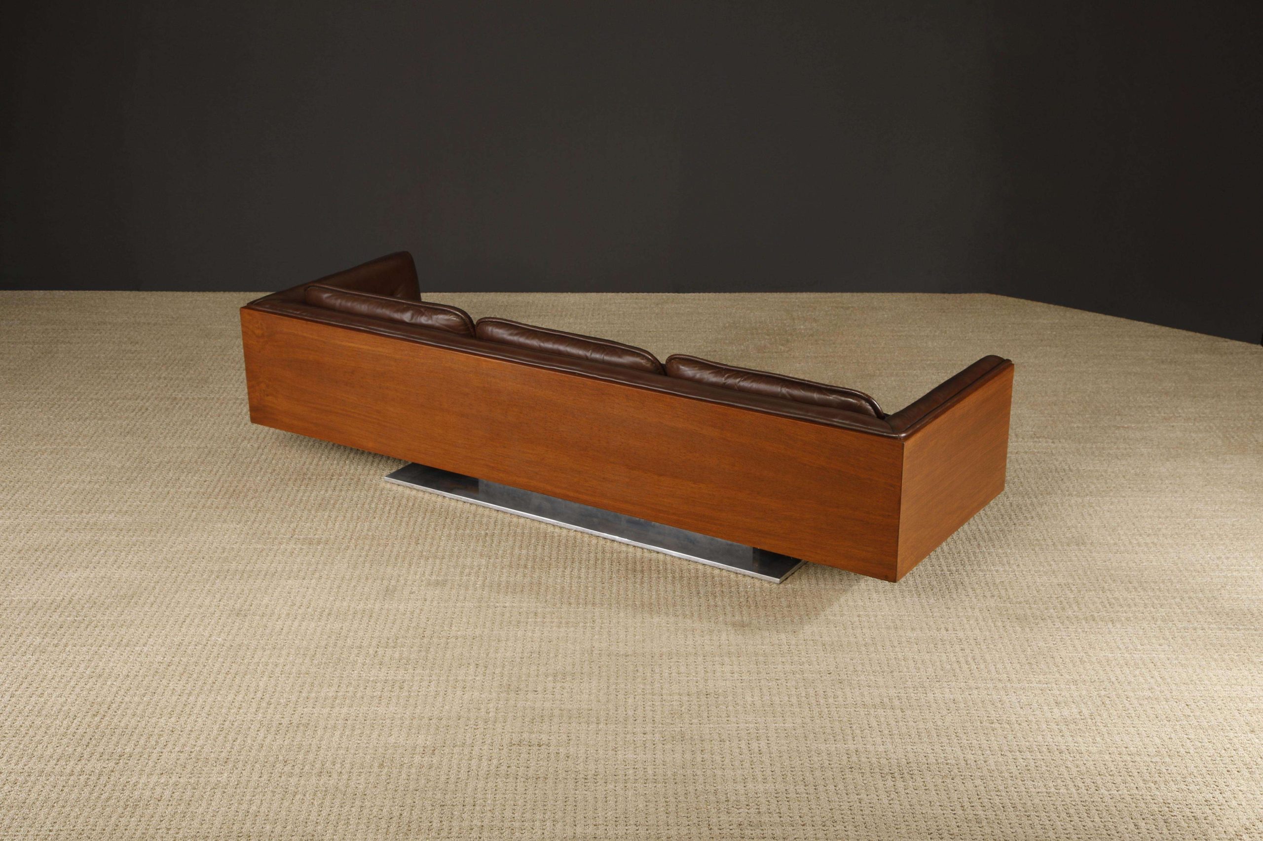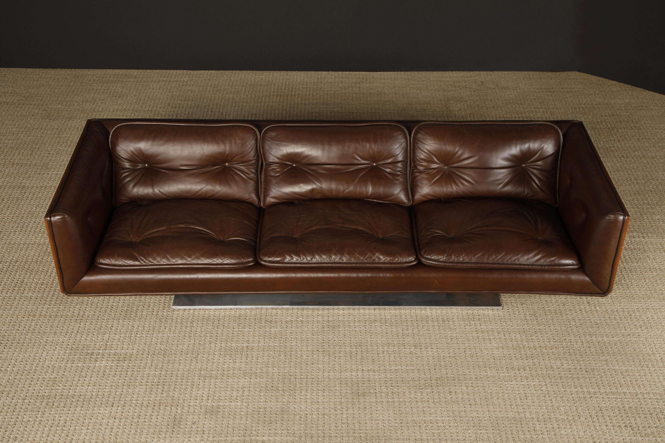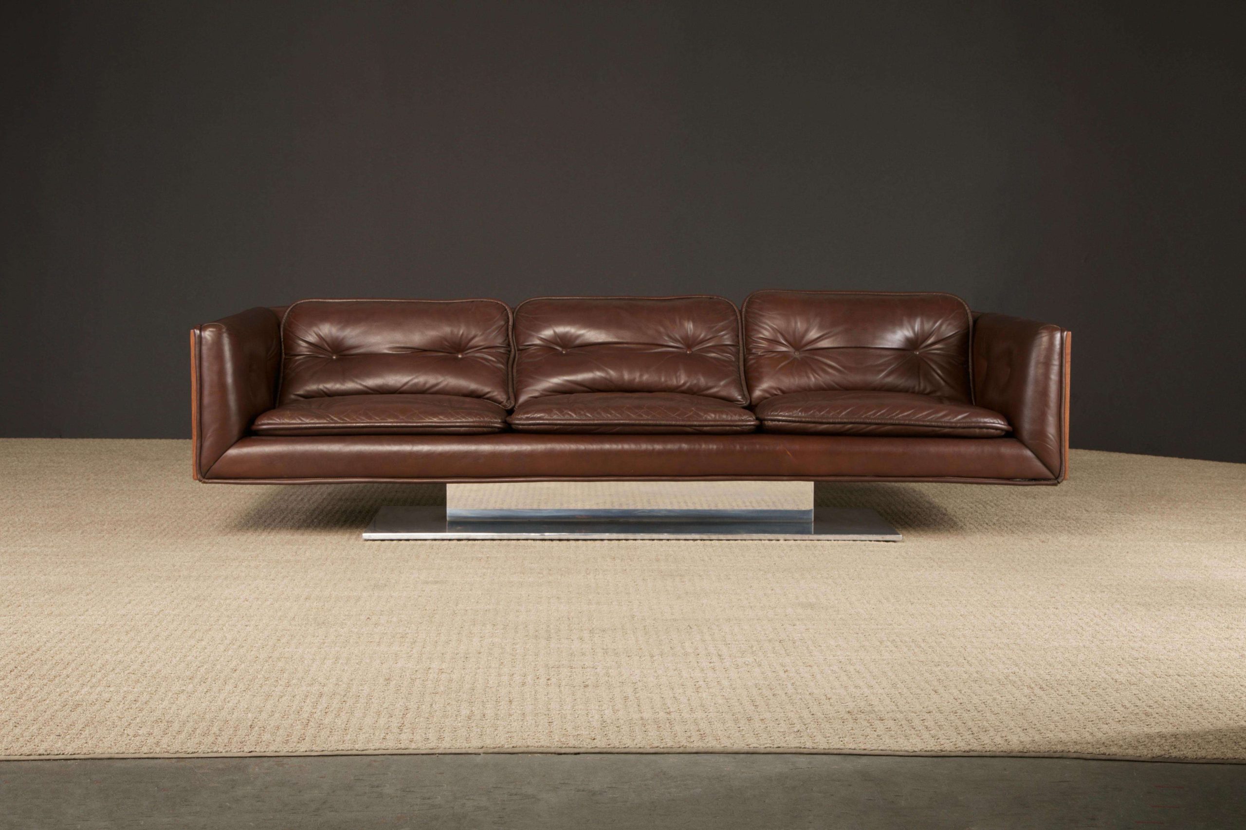 The Warren Platner Executive Leather Case Sofa, designed for Lehigh Leopold circa 1970, measures 235.59 cm wide, 81.28 cm deep, and 67.31 cm high with a seat height of 41.91 cm. This rare collector’s piece features a floating walnut case with deep brown tufted leather upholstery and cushions, supported by a polished steel pedestal base, offering a luxurious and sculptural presence.