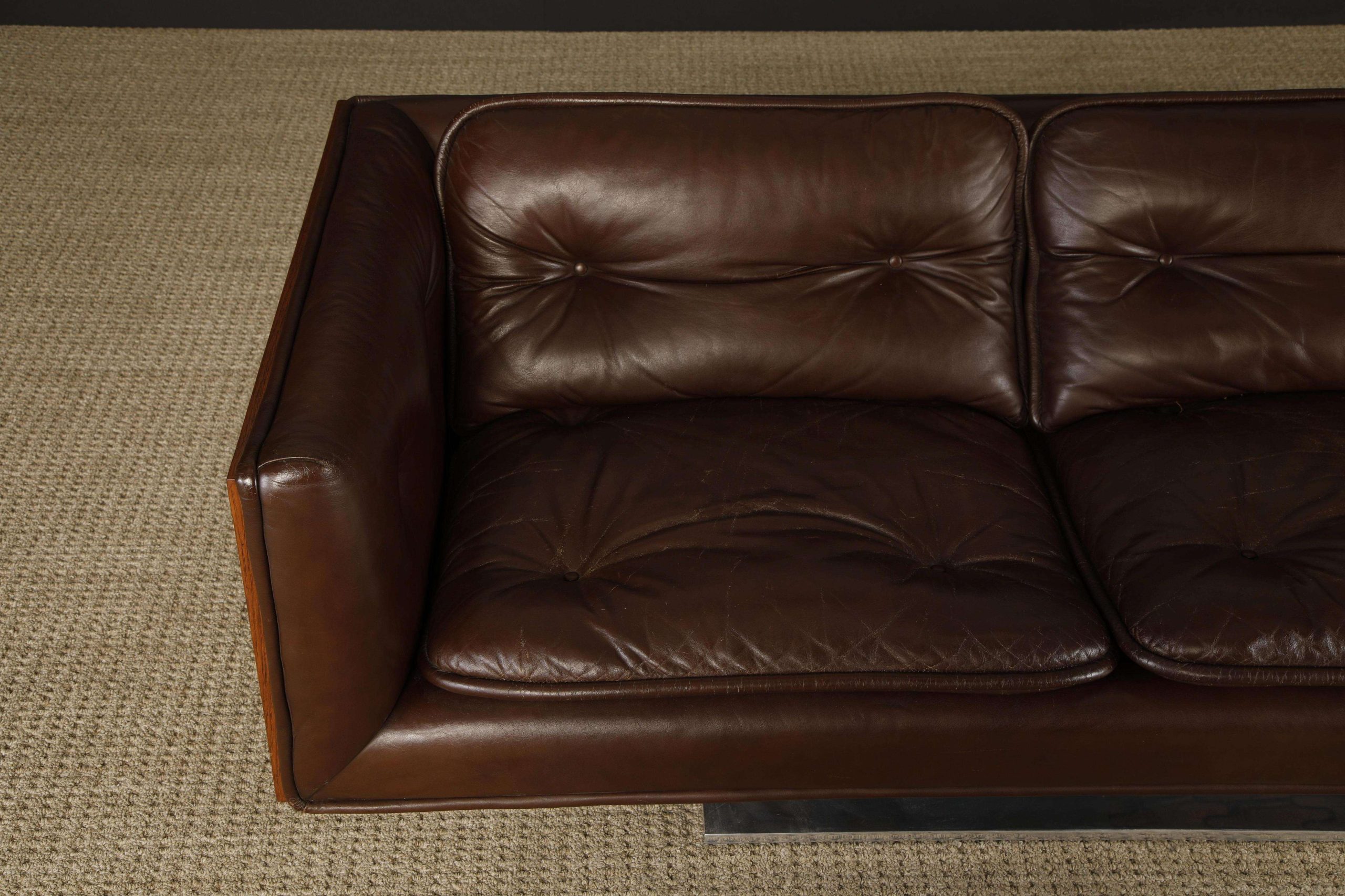 Creator: Lehigh Leopold (Maker), Warren Platner (Designer) Dimensions: Height: 26.5 in (67.31 cm) Width: 92.75 in (235.59 cm) Depth: 32 in (81.28 cm) Seat Height: 16.5 in (41.91 cm) Style: Modern (Of the Period) Materials and Techniques: Chrome, Leather, Walnut Place of Origin: United States Period: 1970-1979 Date of Manufacture: circa 1970 Condition: Good – Lightly used, with very light scratches, or minor cosmetic wear, but has no structural issues. Most antique and vintage items fit this condition.